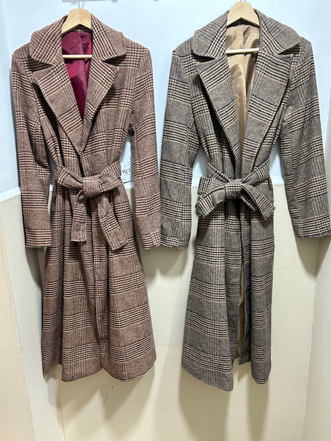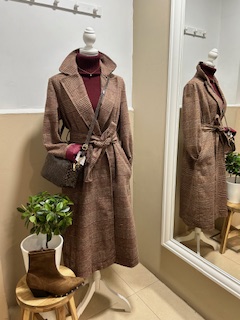 Abrigo paño,cuello solapa, bolsillos laterales.Cierre con cinturón