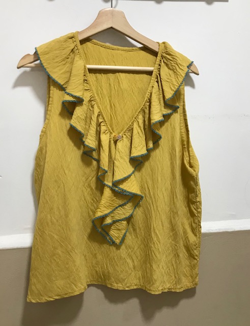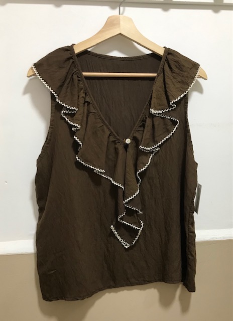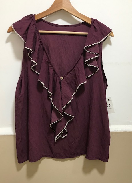 Blusa escote pico con volante , cierre frontal con botones,