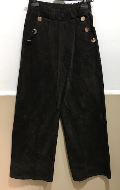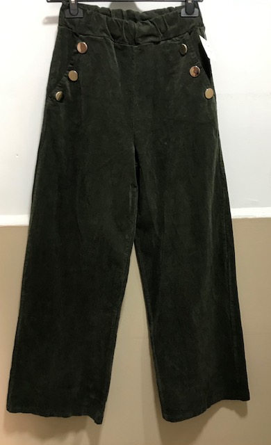 Pantalón pana , cinturilla elástica, bolsillos laterales, adorno de botones dorados .